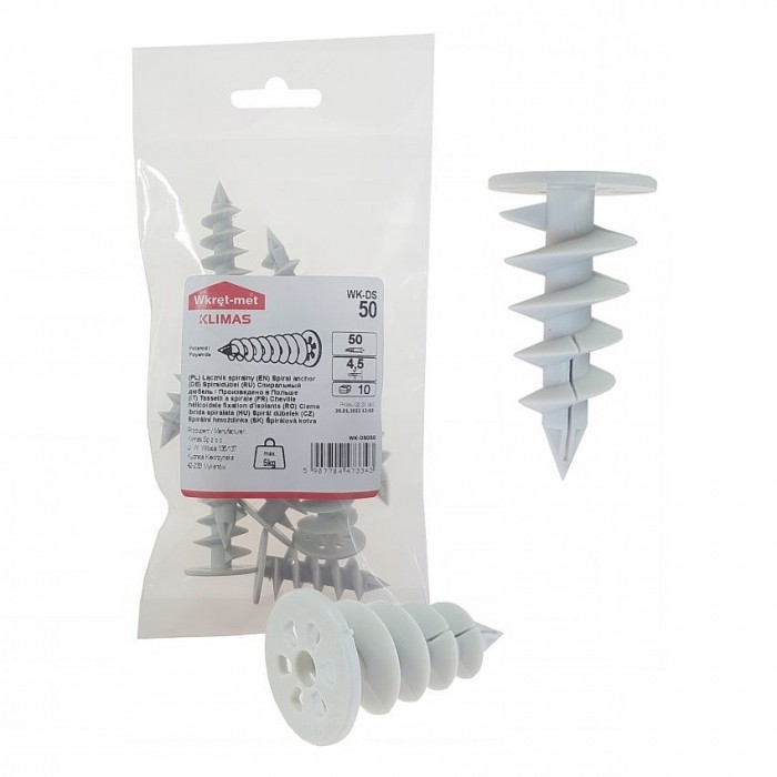 Poliamidowe wkręcane łączniki spiralne przeznaczone są do mocowania lekkich elementów (do max. 5 kg) do ścian ocieplonych styropianem. Szczególnie polecane do montażu skrzynek na listy, numerów budynków, elementów oświetleniowych, lamp, itp. Do przymocowania kołka przeznaczone są wkręty o średnicy 3.5-4,5mm (brak w zestawie). Łączniki pozwalają zachować ciągłość termoizolacji, bez powstawania mostków termicznych.