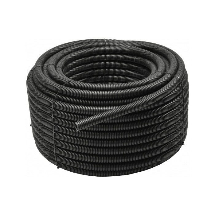 Rura instalacyjna, karbowana, giętka, nie rozprzestrzeniająca płomienia wykonana z PCV w kolorze czarnym, ze stalowym pilotem ułatwiającym przeciąganie przewodów.