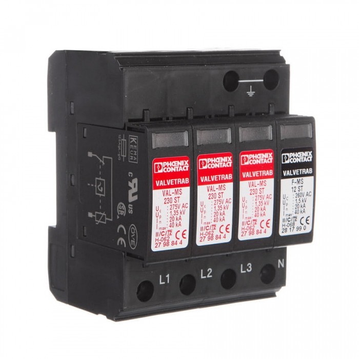Ogranicznik Przepięć AC VAL-MS 230/3+1 PHOENIX CONTACT typ 2, ochronnik najwyższe napięcie trwałej pracy AC 275V , poziom ochrony 1.5 kV , poziom ochrony l-N 1.35kV, poziom ochrony N-PE 1.5kV, znamionowe napięcie AC 240V