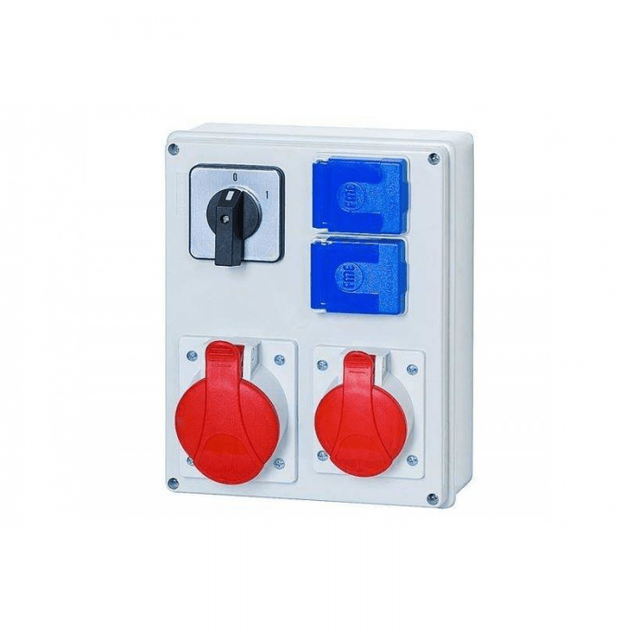Rozdzielnica R-240 16/5,32/5,2x230V, 0/1(32A) natynkowa wyposażona w 1 gniazdo 16A 5P 3-fazowe + 1 gniazdo 32A 5P 3-fazowe + 2 gniazda 230V zamykane klapką + wyłącznik