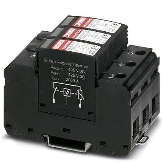 Ogranicznik przepięć dla 2-pinowych izolowanych systemów napięcia stałego 1000V DC. Do montażu na szynie nośnej, 3-pinowa podstawka ze stykiem sygnalizacji zdalnej, trzy wtykowe elementy ochronne z kontrolą termiczną, komunikat o stanie na każdym wtyku.