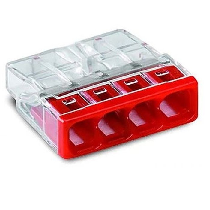 złączka do puszek instalacyjnych COMPACT; doprzewodów jednodrutowych; maks. 2,5 mm²; 4-przew.; kolor obudowyprzezroczysty; kolor pokrywy czerwony; temperatura otoczenia maks. 60°C(T60); 2,50 mm²; transparentny Korzyści: Komfortowe podłączanie przewodów dziękikompaktowej budowieMontaż wtykowy maks. 8 przewodów jednodrutowychZakres przekroju przewodów: 0,5 ... 2,5 mm²Możliwość dowolnego łączenia przewodów o różnych przekrojachMontaż jednodrutowychprzewodów miedzianych przy pomocy zacisku PUSH WIRE®