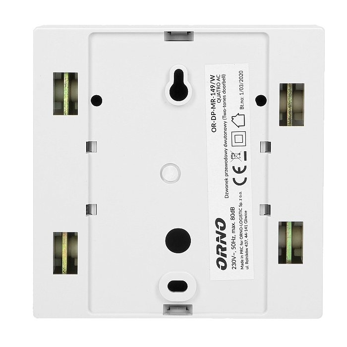 Dzwonek przewodowy, elektromechaniczny Orno OR-DP-MR-149/W o głośności ok. 80 dB. Posiada 2 tony DING-DONG oraz funkcję przeciwblokady łącznika (zabezpieczenie przed nadmiernym obciążeniem).