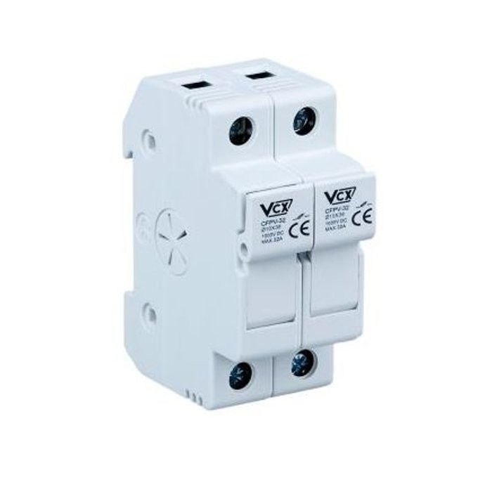 Podstawa gniazdo bezpieczników fotowoltaicznych VCX-PV DC 10x38mm 2P do montażu w instalacja fotowoltaicznych. Rozłączana w stanie bezprądowym, nie zawiera bezpieczników