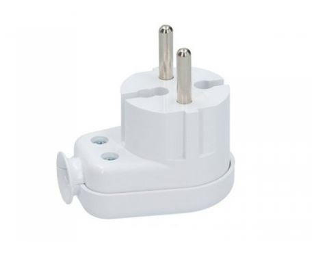 Wtyk kątowy na przewód przeznaczony do gniazdek typu E. Wyposażony został w uziemienie. Wtyk w kolorze białym.