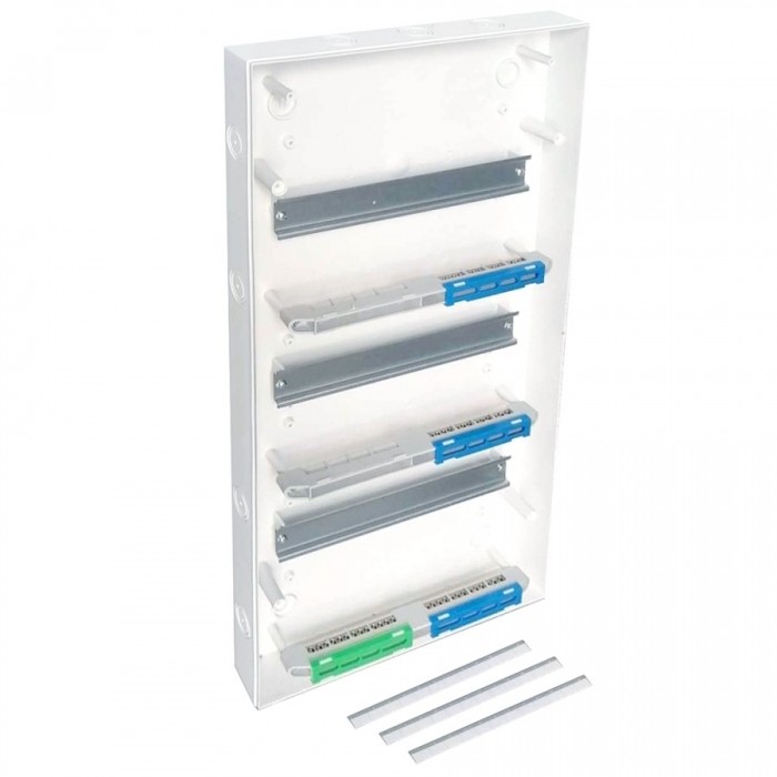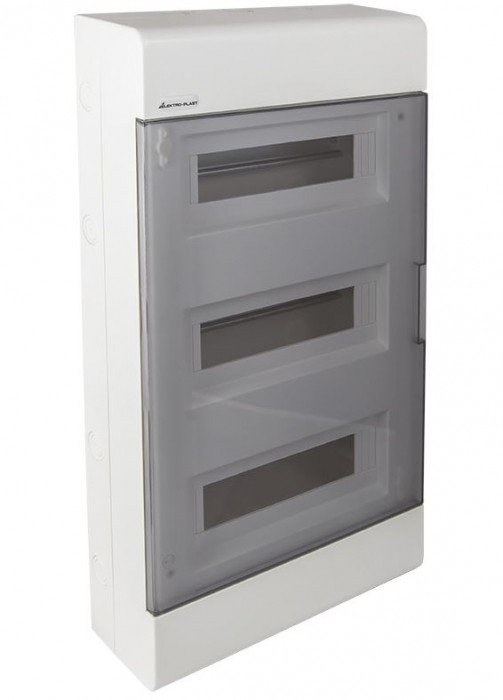 Materiał: Tworzywo ABS Stabilność termiczna pracy: -25°C do +60°C Ilość modułów: 36 modułów - 3x12 modułów Zakres wysokości aparatów: 68-75mm Odporność na uderzenia: IK07 Plombowanie: Tak Kolor obudowy: Biały Kolor drzwi: transparentny-dymiony Unr 230/400V AC Uni 500V AC In 120A Spełnia normy PN-EN 62208:2011 Wymiary: 610x316x110 mm