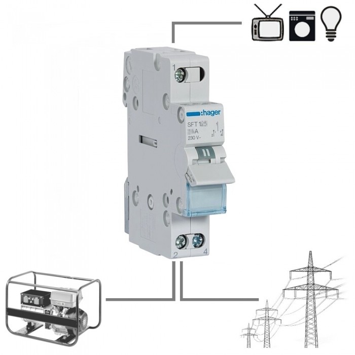 Przełącznik 1-fazowy SFT140 40A stosowany w celu przełączania zasilania 230V AC Sieć-Agregat 1-fazowy, czyli wyboru zasilania: podstawowe i rezerwowe do awaryjnego utrzymania napięcia w budynku po braku napięcia w sieci energetycznej.