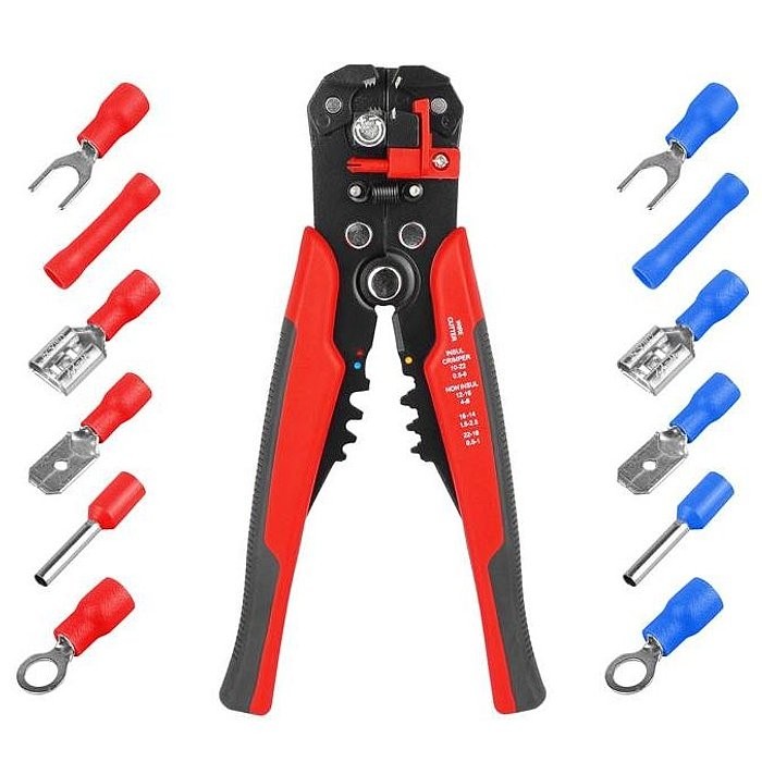 Ściągacz izolacji do kabli i przewodów z wbudowaną zaciskarką i zestawem końcówek izolowanych