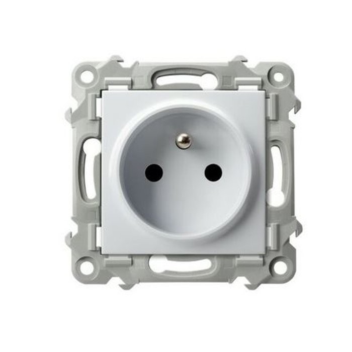 Standardowe gniazdo elektryczne pojedyncze z bolcem uziemiającym. Do kompletu wymagana ramka. Można stosować do systemów ramkowych wielokrotnych.
