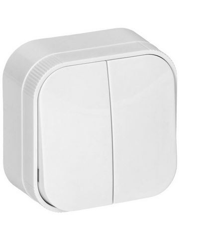 Typ: Włącznik podwójny Stopień ochrony IP20 Kolor: biały Ilość klawiszy: 1 Montaż: natynkowy Prąd znamionowy 10AX Napięcie znamionowe 230V~ Wymiary: 63 x 63 x 35 mm waga 42g Gwarancja 5 lat