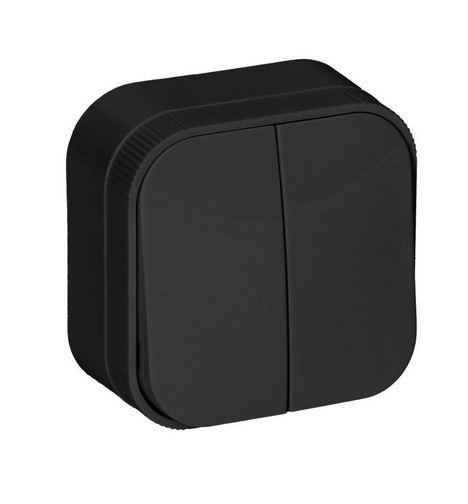 Typ: Włącznik podwójny Stopień ochrony IP20 Kolor: czarny Ilość klawiszy: 2 Montaż: natynkowy Prąd znamionowy 10AX Napięcie znamionowe 230V~ Wymiary: 63 x 63 x 35 mm waga 42g Gwarancja 5 lat