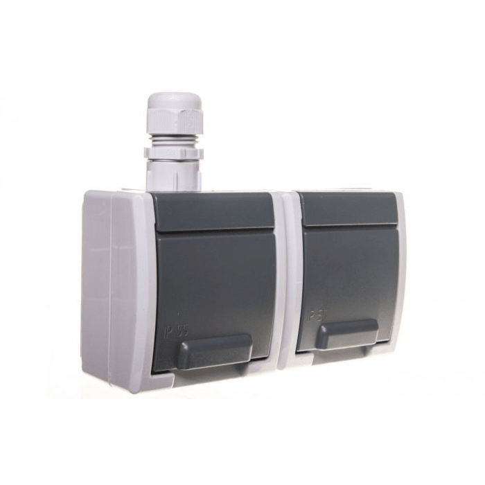 CECHY PRODUKTU: Montaż: natynkowy Prąd znamionowy: 16A Napięcie znamionowe: 250V Stopień ochrony: IP55 Liczba gniazd: 2 Kolor obudowy: jasnoszary Kolor klapki: ciemnoszary Konfiguracja: 2x2P+Z Wymiary: 153x81x56mm Uziemienie: tak Przesłony torów prądowych: tak Typ zacisków: zaciski śrubowe