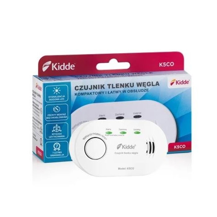 Czujnik tlenku węgla K5CO wyposażony w sensor elektrochemiczny Kidde, gwarantujący 10-letni okres pracy. Zasilanie bateryjne umożliwia zamontowanie detektora w optymalnym miejscu w pomieszczeniu oraz zapewnia ochronę także w przypadku zaniku napięcia zasilania w sieci. Przekroczenie dopuszczalnego poziomu CO sygnalizowane jest optycznie (czerwona dioda LED) oraz akustycznie (głośny, pulsacyjny alarm dźwiękowy o sile 85dB).