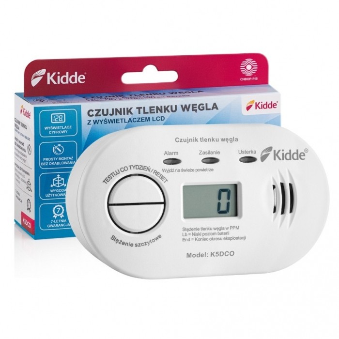 Czujnik tlenku węgla z wyświetlaczem K5DCO wyposażony w sensor elektrochemiczny Kidde, gwarantujący 10-letni okres pracy. Zasilanie bateryjne umożliwia zamontowanie detektora w optymalnym miejscu w pomieszczeniu oraz zapewnia ochronę także w przypadku zaniku napięcia zasilania w sieci.