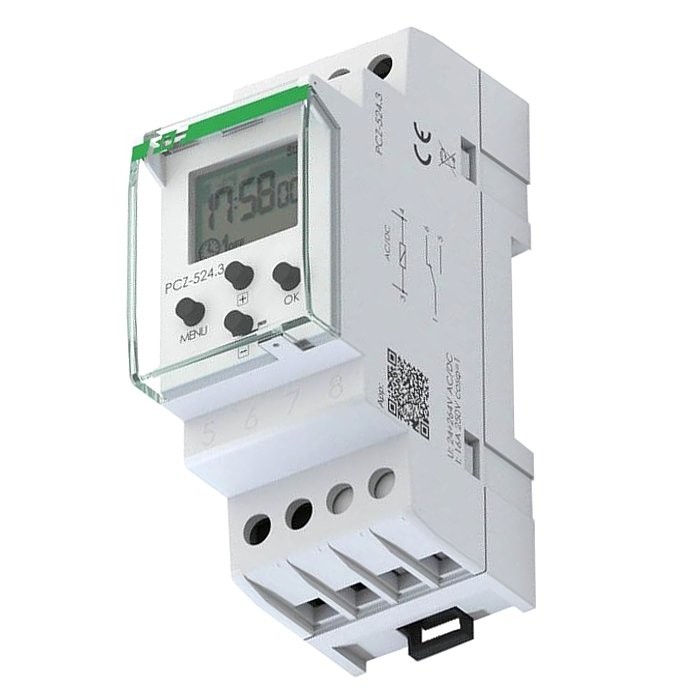 Zegar sterujący cyfrowy PCZ-524.3 16A astronomiczny jednokanałowy na szynę DIN TH35, bez przer.noc., pamięć stanu przekaźnika, bezprzewodowa komunikacja NFC do programowania z aplikacji, zas.24V - 264V AC / DC, prąd styku do 16A AC