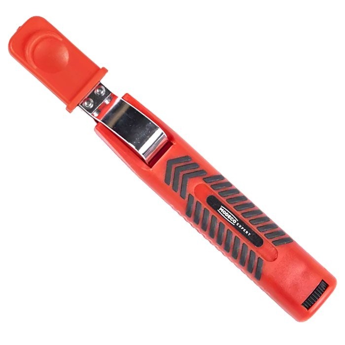 obrotowy nóż wewnętrzny - do wykonywania cięć okrągłych i podłużnych, 2 ostrza zewnętrzne proste - do precyzyjnego i szybkiego nacinania izolacji, 2 ostrza zewnętrzne hakowe - do bezpiecznego zdejmowania płaszcza zewnętrznego.