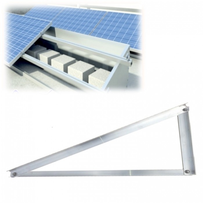 Trójkąt montażowy złożony z kątowników aluminiowych o wymiarach 40x40x3 mm do montażu paneli fotowoltaicznych na dachu płaskim - poziomym lub o małym spadzie. Długości elem.: 167+150+85cm