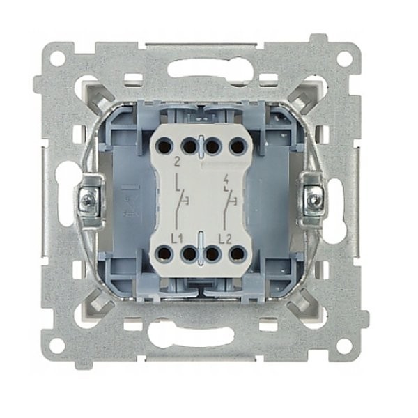 Przycisk podwójny dedykowany do współpracy z ramkami serii Simon54. Przycisk posiada 2 wejścia i 2 wyjścia (dwuobwodowy), może być wykorzystany np. jako przycisk dzwonkowy lub do wyzwalania przekaźników bistabilnych.