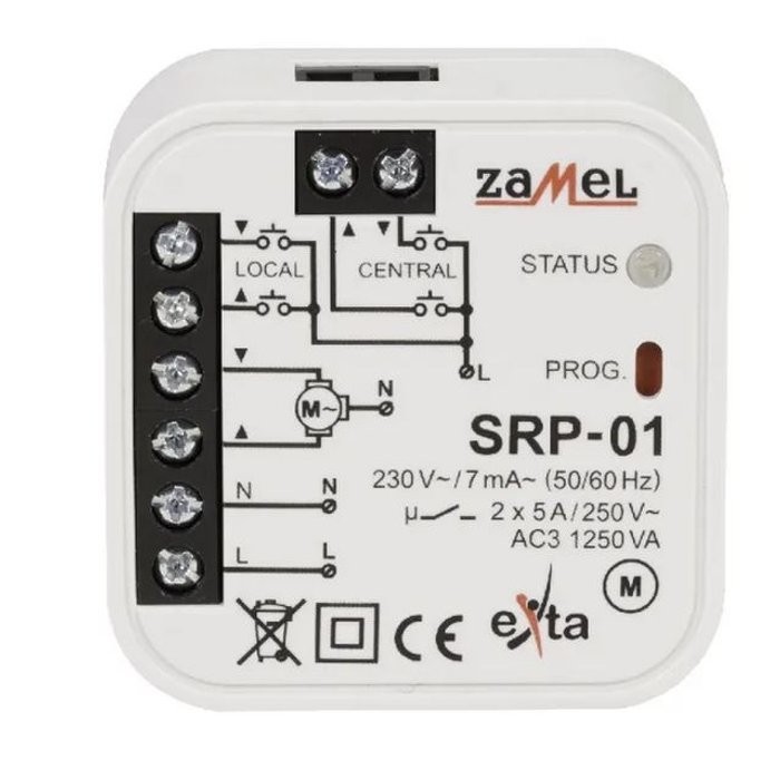 Sterownik rolet dopuszkowy SRP-01 przeznaczony do lokalnego lub/i centralnego sterowania roletami okiennymi lub innymi urządzeniami napędzanymi silnikami jednofazowymi 230 V~.