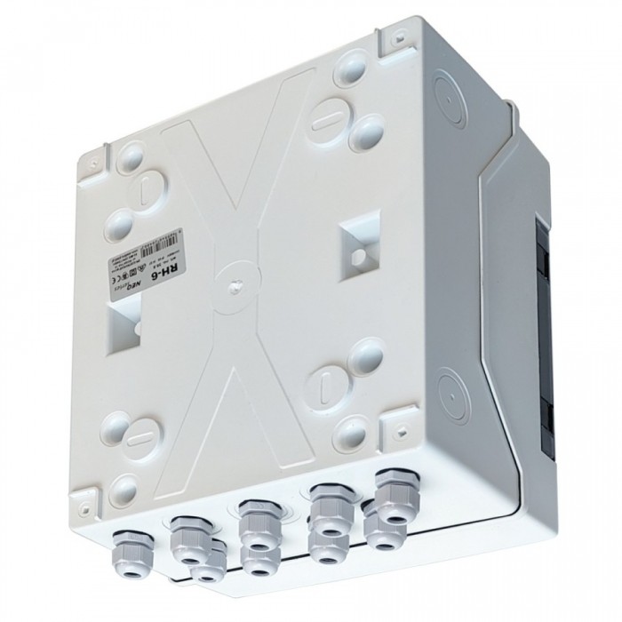 Rozdzielnica fotowoltaiczna DC RH-6 PV 2xT12 przeznaczona do zabezpieczenia 2 łańcuchów DC, wyposażona w 2 ograniczniki przepięć typu T1/T2 PhoenixContact, 9 dławików PG9 do wyprowadzenia przewodów DC 4 lub 6mm2 oraz uziemienia