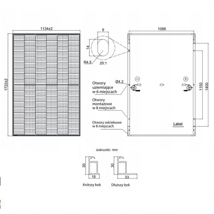 - moc maksymalna: 415W - technologia ogniw połówkowych: 120 półogniw monokrystalicznych - sprawność modułu 21,3% - dodatnia tolerancja mocy wyjściowej 0~+5W - współczynnik temperaturowy Isc (αIsc): +0,045 %/°C - współczynnik temperaturowy Voc (βVoc): -0,275 %/°C - Współczynnik temperaturowy Pmax (γPmax): -0,350 %/°C - typ konektora: MC4 (1000V) MC4.EVO2 (1500V) - długość kabli przyłączeniowych: 1000mm (+) / 1000mm (-) - przekrój żył kabli przyłączeniowych: 4mm2 - wymiary: 1722x1134x30mm - waga: 19,5kg - max. obciążenie statyczne (od przodu): 5400 Pa - max. obciążenie statyczne (od spodu): 2400 Pa - napięcie obwodu otwartego STC: 37.45V - napięcie mocy maksymalnej STC: 31.61V - prąd zwarciowy STC: 14.02A - prąd mocy maksymalnej STC: 13.13A
