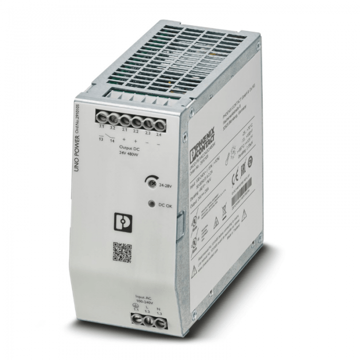 Zasilacze taktowane w obwodzie pierwotnym, UNO POWER, Przyłącze śrubowe, Montaż na szynie montażowej, wejście: 1-fazowy, wyjście: 24 V DC / 20 A, regulacja w zakresie 24 V DC ... 28 V DC