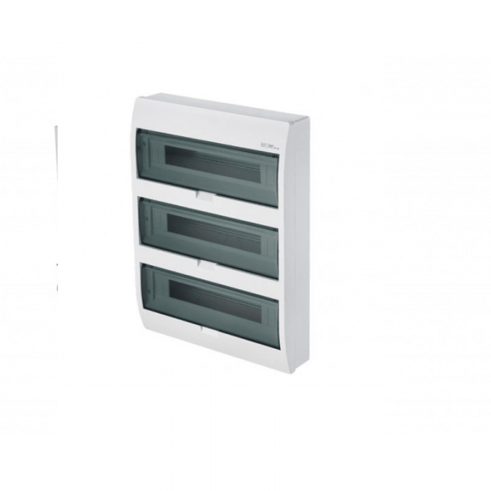 Trzyrzędowa rozdzielnica z tworzywa sztucznego w kolorze białym, z drzwiczkami transparentnymi. Wyposażona m.in. w listwy zaciskowe N+PE oraz szynę montażową TH35. RN o wymiarach 410x784x98 mm.