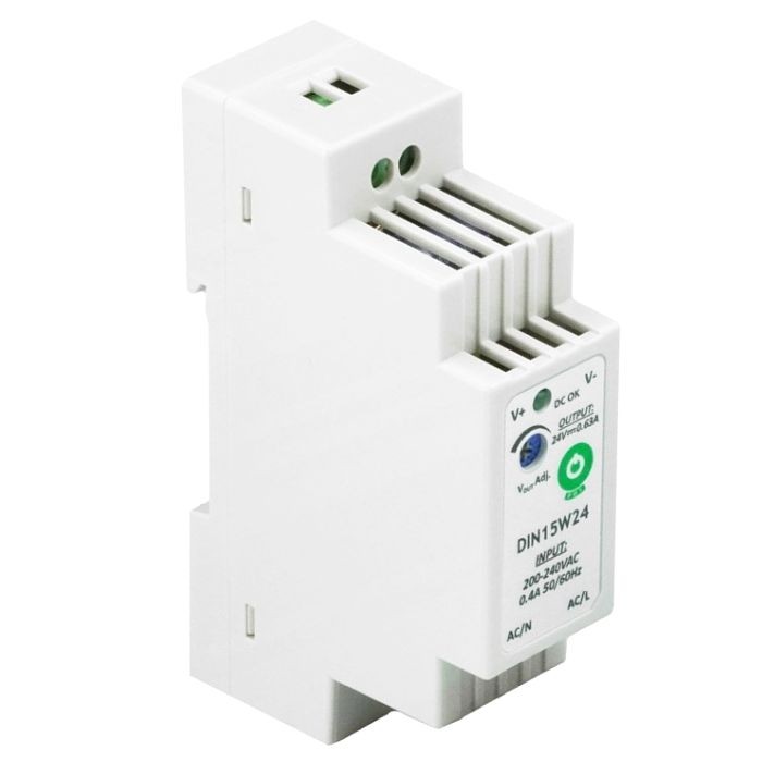 Napięcie zasilania: od 200V do 240VAC Typ: impulsowy, elektroniczny Napięcie wyjściowe: 24V DC Prąd wyjściowy: 0,63 A Moc: 15 W Montowany na szynę DIN Wyprowadzenia w postaci złącz śrubowych Sygnalizacja prawidłowego napięcia wyjściowego: dioda DC OK Potencjometr do regulacji napięcia wyjściowego Wymiary: 92,5 x 56 x 25 mm Masa: 100 g