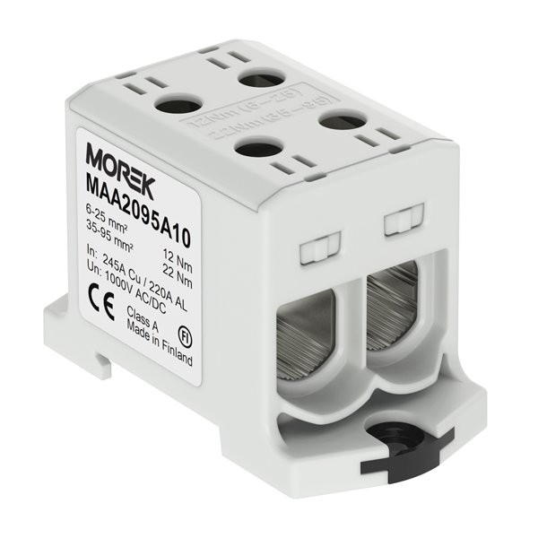 Indeks producenta: MAA2095A10 Klasa palności materiału izolacyjnego wg. UL 94: V0 Kolor: szary Liczba poziomów: 1 Liczba zacisków na piętro: 4 Materiał elementu izolacyjnego: Tworzywo termoplastyczne Napięcie znamionowe [V]: 1000 Pozycja połączenia: Z boku / boczny Przekrój przyłączanego przewodu jednodrutowego [mm2]: od 6mm2 do 95mm2