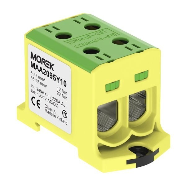 Indeks producenta: MAA2095Y10 Klasa palności materiału izolacyjnego wg. UL 94: V0 Kolor: Zielono-żółty Liczba poziomów: 1 Liczba zacisków na piętro: 4 Materiał elementu izolacyjnego: Tworzywo termoplastyczne Napięcie znamionowe [V]: 1000 Pozycja połączenia: Z boku / boczny Przekrój przyłączanego przewodu jednodrutowego [mm2]: od 6mm2 do 95mm2