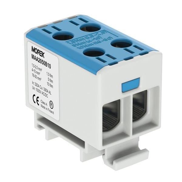 Indeks producenta: MAA2050B10 Klasa palności materiału izolacyjnego wg. UL 94: V0 Kolor: Niebieski Liczba poziomów: 1 Liczba zacisków na piętro: 4 Materiał elementu izolacyjnego: Tworzywo termoplastyczne Napięcie znamionowe [V]: 1000 Pozycja połączenia: Z boku / boczny Przekrój przyłączanego przewodu jednodrutowego od 1,5mm2 do 50mm2