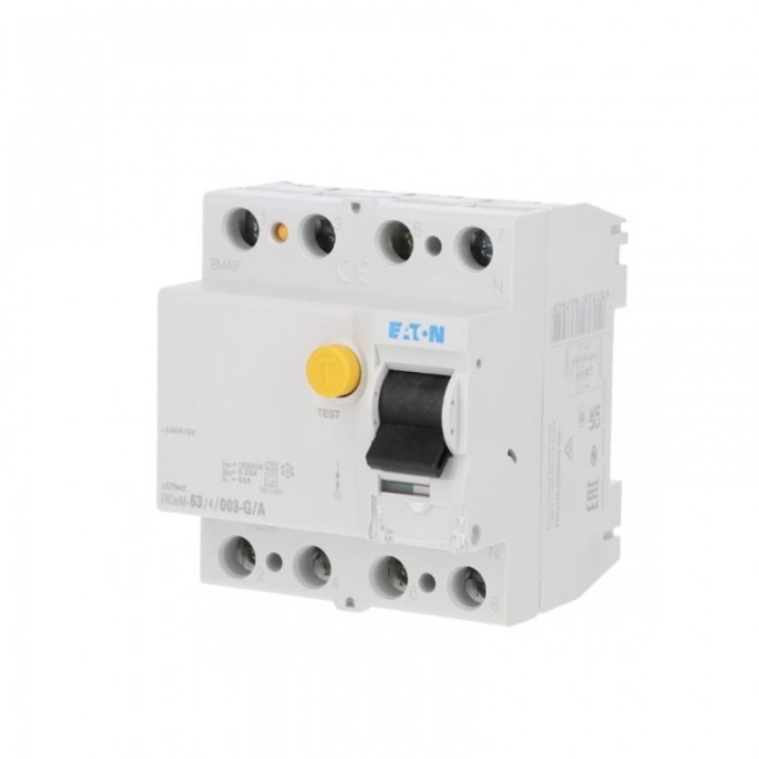 Liczba biegunów: 4 (czterobiegunowy) Prąd znamionowy (In): 63 A Znamionowy prąd różnicowy (I?n): 0,03 A (30 mA) Typ czułości: G/A (zgodnie z oznaczeniem producenta) Napięcie znamionowe: 415 V AC, częstotliwość 50/60 Hz Napięcie izolacji: 440 V; wytrzymałość udarowa: 4 kV Wytrzymałość zwarciowa (Icw): 10 kA Wyzwalanie krótkozwłoczne: tak Stopień ochrony: IP20 Zaciski przewodów: 1,5–35 mm? Szerokość montażowa: 4 moduły (ok. 70 mm); głębokość wbudowania: 70,5 mm Zakres temperatur pracy: -25 °C do 75 °C Konstrukcja i montaż: szyna DIN, przeznaczony do zabudowy w rozdzielnicach modułowych Standardy techniczne: konstrukcja oparta na wymaganiach IEC/EN 61008