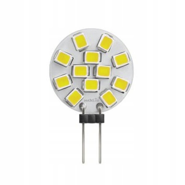 Moc: 2W Napięcie zasilania:12V DC Barwa światła: biała zimna Temperatura barwowa: 6000K Strumień świetlny: 140 lm Typ mocowania: G4 Typ diody LED: SMD Kąt rozsyłu światła: 180° WYMIARY: - średnica talerzyka: 20mm - długość całkowita: 33 mm - wysokość: 8,5 mm Trwałość: 50 000 godzin Ilość cykli włącz/wyłącz: 50000 Wskaźnik oddawania barw: >80 Możliwość ściemniania: nie Materiał obudowy: PCB