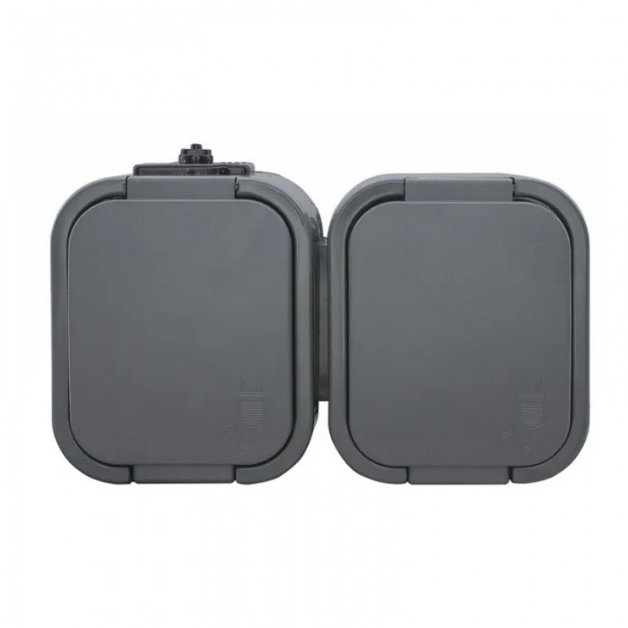 Gniazdo podwójne SCHUKO natynkowe szare z klapką szarą