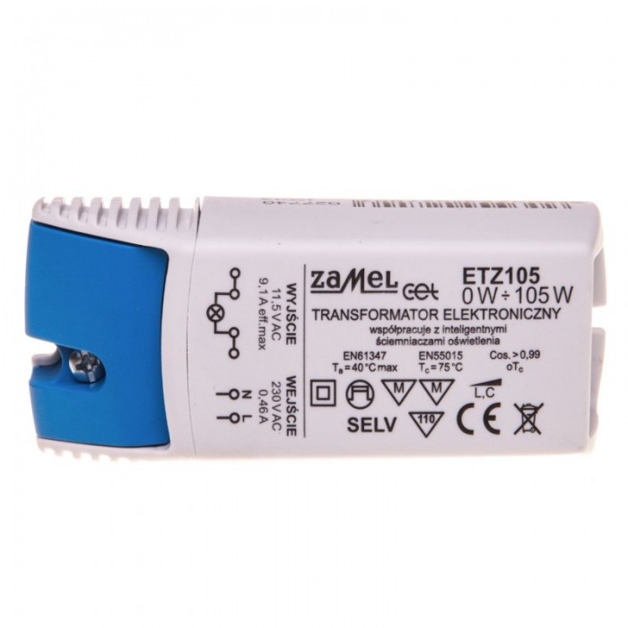 Transformator ETZ105 o mocy wyjściowej 105 W, przeznaczony jest do współpracy z halogenowymi źródłami światła, zasilanymi napięciem 12 V AC. Cechą charakterystyczną transformatora jest możliwość zasilania bardzo małych obciążeń od 0 W. Urządzenie posiada szereg zabezpieczeń (zwarciowe, przeciążeniowe, termiczne) oraz opatentowanych rozwiązań, które zwiększają żywotność żarówek halogenowych współpracujących z transformatorami, oraz poprawiają bezpieczeństwo użytkowania samych urządzeń. ETZ105 przeznaczony jest do montażu natynkowego. Podłączenia dokonuje się za pomocą złącz śrubowych. Transformator może współpracować z inteligentnymi typami ściemniaczy oświetlenia.