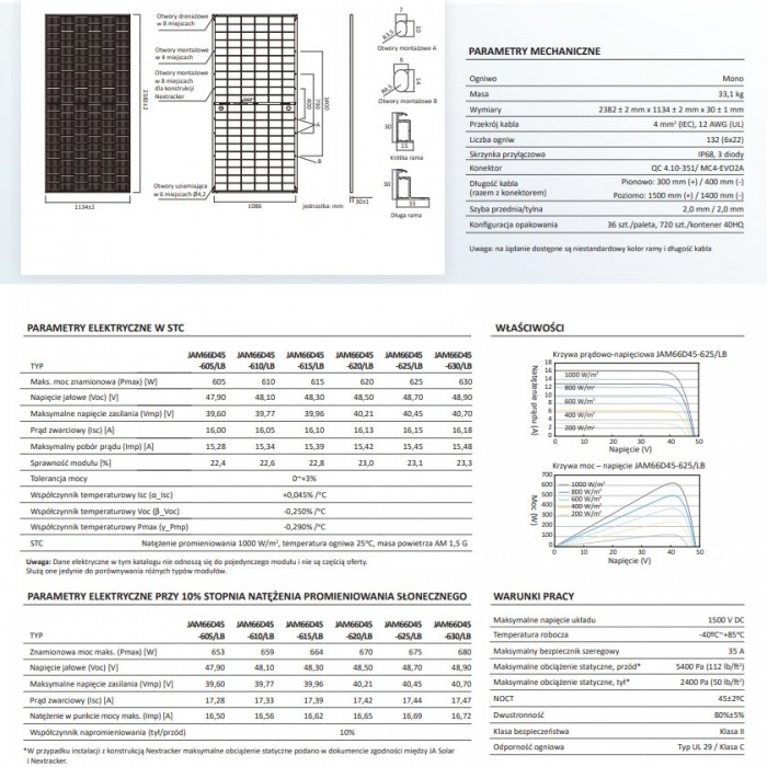 Model 620 W – sprawność modułu sięga aż 22,7%. Masa 33,1 kg Wymiary 2382 ± 2 mm x 1134 ± 2 mm x 30 ± 1 mm Przekrój kabla 4 mm2 (IEC), 12 AWG (UL) Liczba ogniw 132 (6x22) Skrzynka przyłączowa IP68, 3 diody Konektor QC 4.10-351/ MC4-EVO2A Długość kabla: do 140cm (razem z konektorem) Szyba przednia/tylna 2,0 mm / 2,0 mm. Napięcie Uoc: 48,50 V Napięcie pracy Ump: 40,21 V Prąd zwarcia Isc: 16,13 A Prąd pracy Imp: 15,42 A Sprawność: 23%