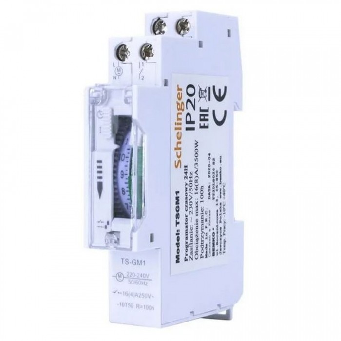 zastosowanie sterowanie dowolnym urządzeniem elektrycznym w cyklu 24 godzinnym typ mechaniczny dobowy tryby pracy tryb 1 - ciągłe za łączeni , tryb 2 - załączenie/wyłączenie automatyczne max. moc obciążenia 3500W max. prąd obciążenia 16A montaż :szyna DIN/TH/TS 35mm styki 1NO napięcie zasilające ~220-240V (±10%) częstotliwość pracy 50/60HzHz maksymalne obciążenie styków sterujących 10A/250V~ zużycie energii przez wyłącznik 0,5W dokładność zegara ±3 sek. / dzień przy temperaturze otoczenia 22°C podtrzymanie zasilania R max 100h podziałka programatora (liczba programów) 96 klawiszy/24h minimalny czas załączenia / wyłączenia (dokładność) 15 min maksymalny przekrój przewodów przyłączeniowych 2,5 mm² temperatura pracy od -10°C do +50°C Stopień ochrony IP20 klasa ochronności II materiał zacisków/śrubm stal ocynkowana przeźroczysta szybka ochronna tak deklaracje/certyfikatym CE, EAC, RoHS oznaczenie producenta A26-TSGM