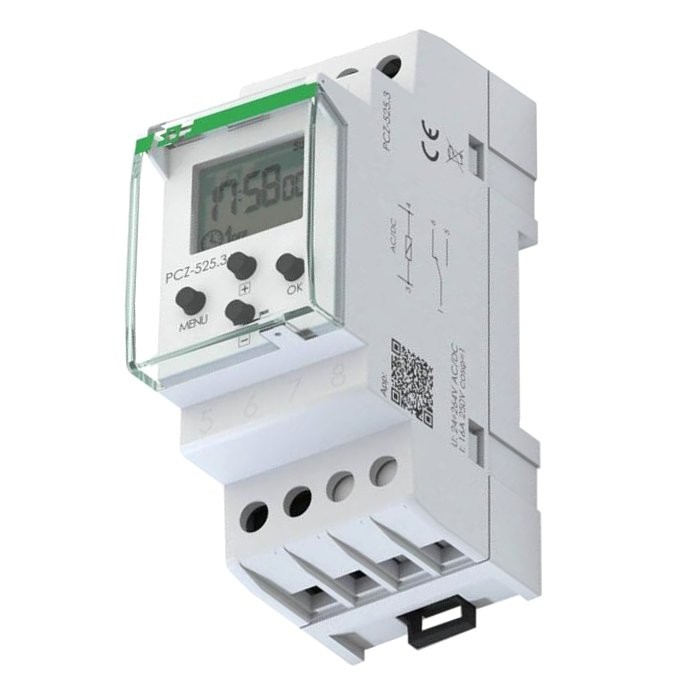Zegar sterujący cyfrowy PCZ-525.4 16A astronomiczny jednokanałowy na szynę DIN TH35, z programowalną przerwą nocną, pamięć stanu przekaźnika, bezprzewodowa komunikacja NFC do programowania z aplikacji, zas.24V - 264V AC / DC, prąd 16A