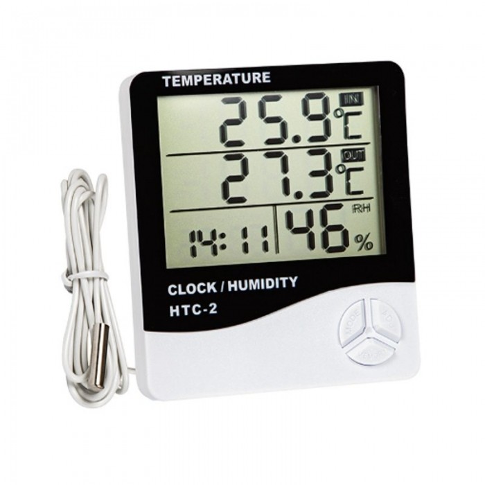 Opis: HTC-2 to kompaktowa stacja pogody wyposażona w czytelny wyświetlacz LCD, umożliwiająca jednoczesne monitorowanie temperatury wewnętrznej, zewnętrznej oraz wilgotności powietrza. Urządzenie posiada funkcję zegara z możliwością ustawienia alarmu oraz rejestruje wartości maksymalne i minimalne dla temperatury i wilgotności. Dzięki prostemu panelowi sterowania użytkownik może łatwo zmienić tryb godziny (12/24H) oraz jednostkę temperatury (°C/°F).