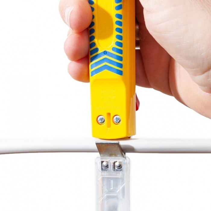 wykonanie: z haczykowatym ostrzem zakres roboczy ∅: 8–28 mm Jedno ostrze do rozpruwania przewodu założone na nożyk - gotowy do pracy ( brak ostrza zapasowego