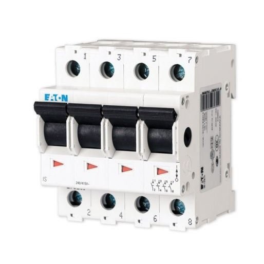 Rozłącznik izolacyjny IS-100/4 firmy Eaton o prądzie znamionowym 100A i 4 stykach (4 bieguny) pełni funkcję głównego wyłącznika prądu w rozdzielnicach w budynkach z instalacją TN.