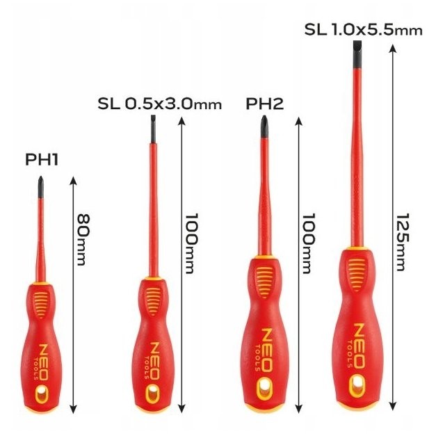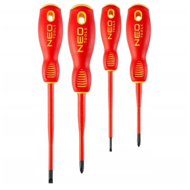 Zestaw wkrętaków izolowanych 4-elementy 04-144 NEO TOOLS 1000V, stal S2. krzyżowe PH1x80mm, PH2x100mm, płaskie 5.5x1.0x125mm, 3.0x0.5x100mm