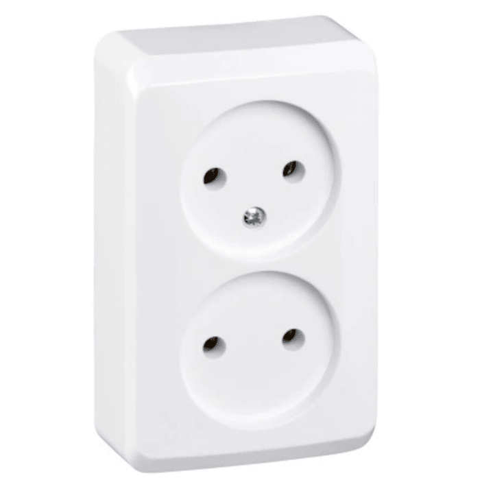 Gniazdo wykonane jest z materiału o zwiększonej odporności na uderzenia i promienie UV w kolorze białym. Produkt posiada zaciski śrubowe. Gniazdo podwójne 2P charakteryzuje się podwyższonym stopniem ochrony IP20. Produkt jest kompletny.